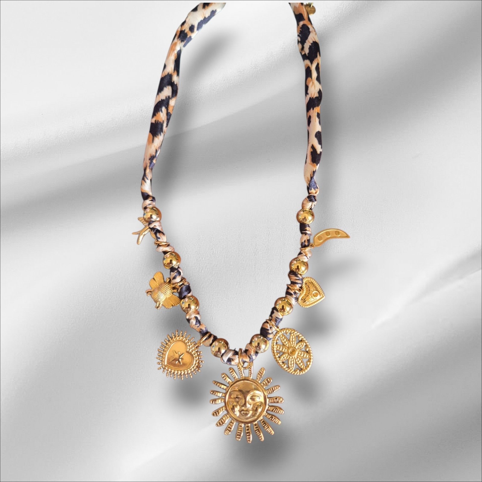 Ένα εντυπωσιακό κολιέ με λεοπάρ υφασμάτινη κορδέλα και χρυσά charms εμπνευσμένα από τον ήλιο, το φεγγάρι και τα σύμβολα της αγάπης. Το Astro Love είναι το απόλυτο statement piece για όσες λατρεύουν το μυστήριο, τη λάμψη και τα μοναδικά αξεσουάρ. Φοριέται μόνο του ή σε layering!