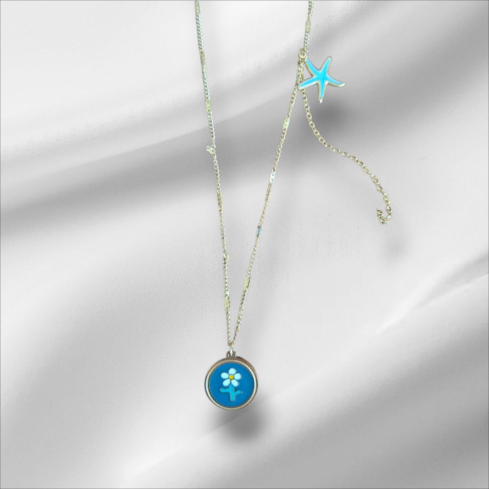 Η λεπτή χρυσή αλυσίδα, ο γαλάζιος αστερίας και το μενταγιόν λουλουδάκι συνθέτουν ένα κολιέ που θα σας κερδίσει με την απλότητά του. Το Blue Bloom είναι ιδανικό για να φωτίσει τις εμφανίσεις σας με μια δόση καλοκαιρινού ρομαντισμού και παιχνιδιάρικης διάθεσης.