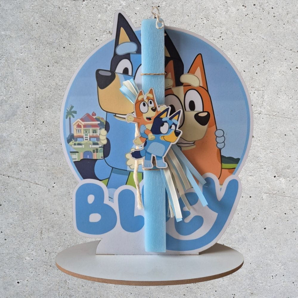 Αυτή η λαμπάδα δεν είναι απλά μια λαμπάδα — είναι ολόκληρη περιπέτεια με την παρέα των Bluey! Με ξύλινη βάση ύψους 35cm και γαλάζια λαμπάδα 30cm, φέρνει μαζί της τους αγαπημένους ήρωες Bluey και Bingo για να κάνουν το Πάσχα πιο παιχνιδιάρικο από ποτέ.