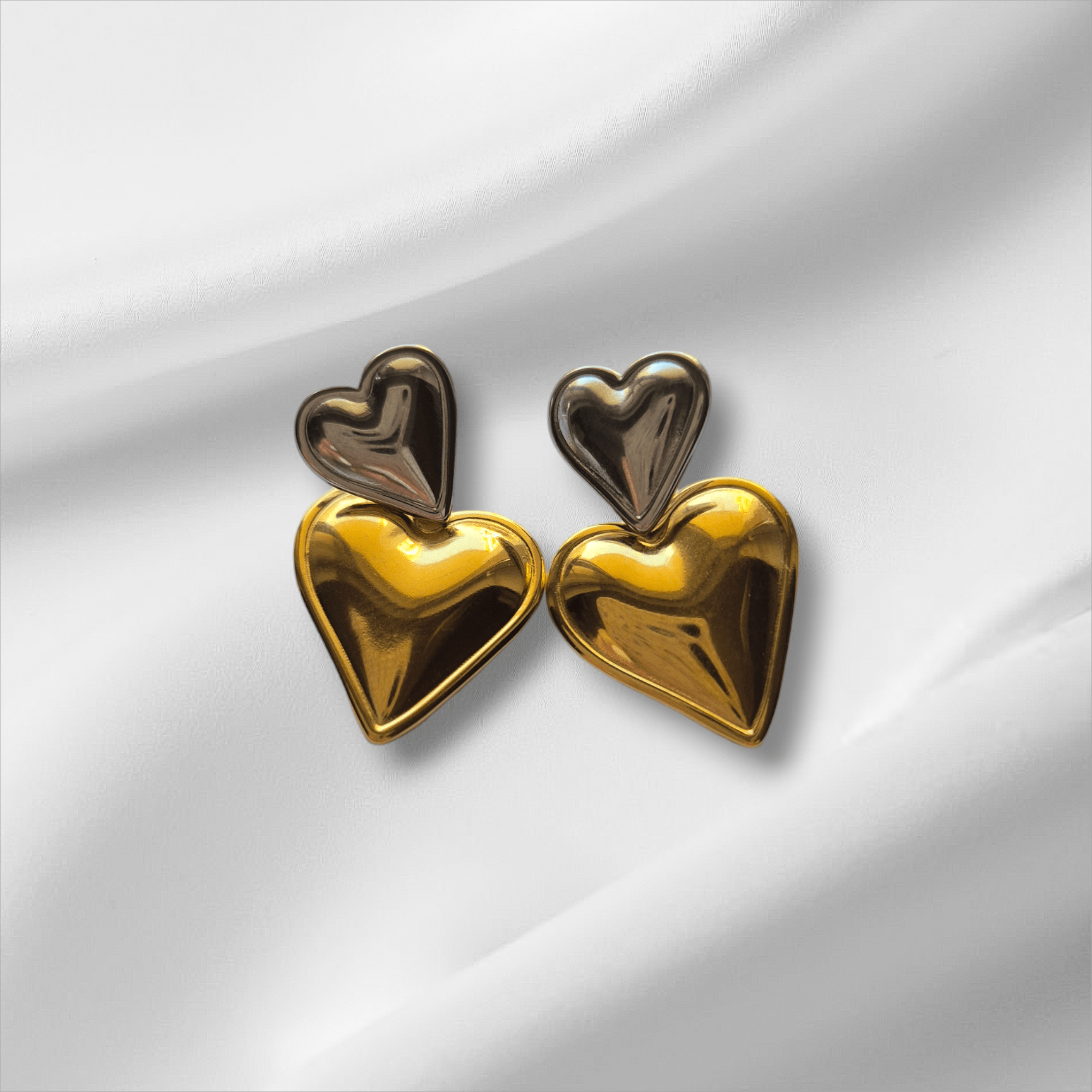 Τα σκουλαρίκια είναι κατασκευασμένα από ατσάλι και διαθέτουν έναν κομψό σχεδιασμό με διπλή καρδιά. Η πάνω καρδιά είναι ασημί, ενώ η κάτω καρδιά έχει χρυσαφένια απόχρωση, δημιουργώντας μια όμορφη αντίθεση που τραβάει το βλέμμα. Ιδανικά για να προσθέσουν μια μοντέρνα και κομψή πινελιά σε οποιαδήποτε εμφάνιση.