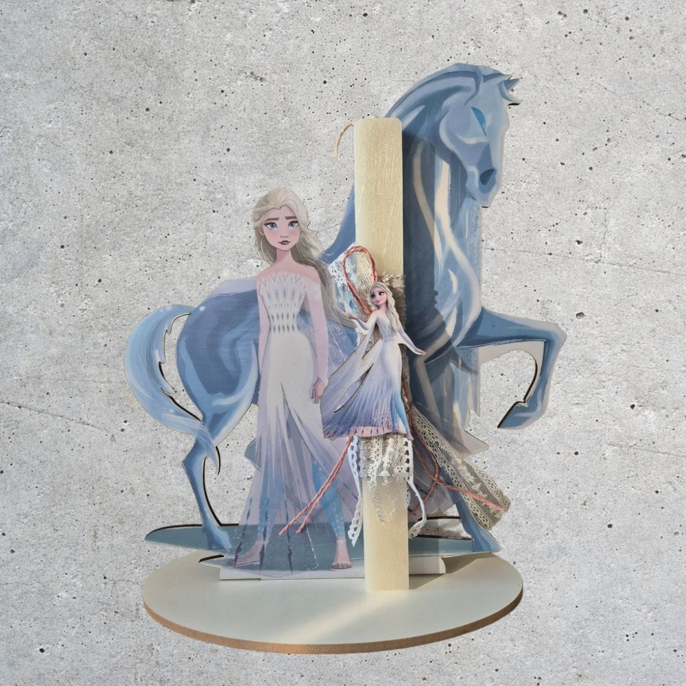 Μια ονειρεμένη πασχαλινή πρόταση για μικρές πριγκίπισσες που λατρεύουν τα παραμύθια! Η εντυπωσιακή ξύλινη κατασκευή ύψους 35 cm με την Έλσα «ζωντανεύει» τη μαγεία, ενώ η μπεζ λαμπάδα των 30 cm δένει τέλεια με το σύνολο.
