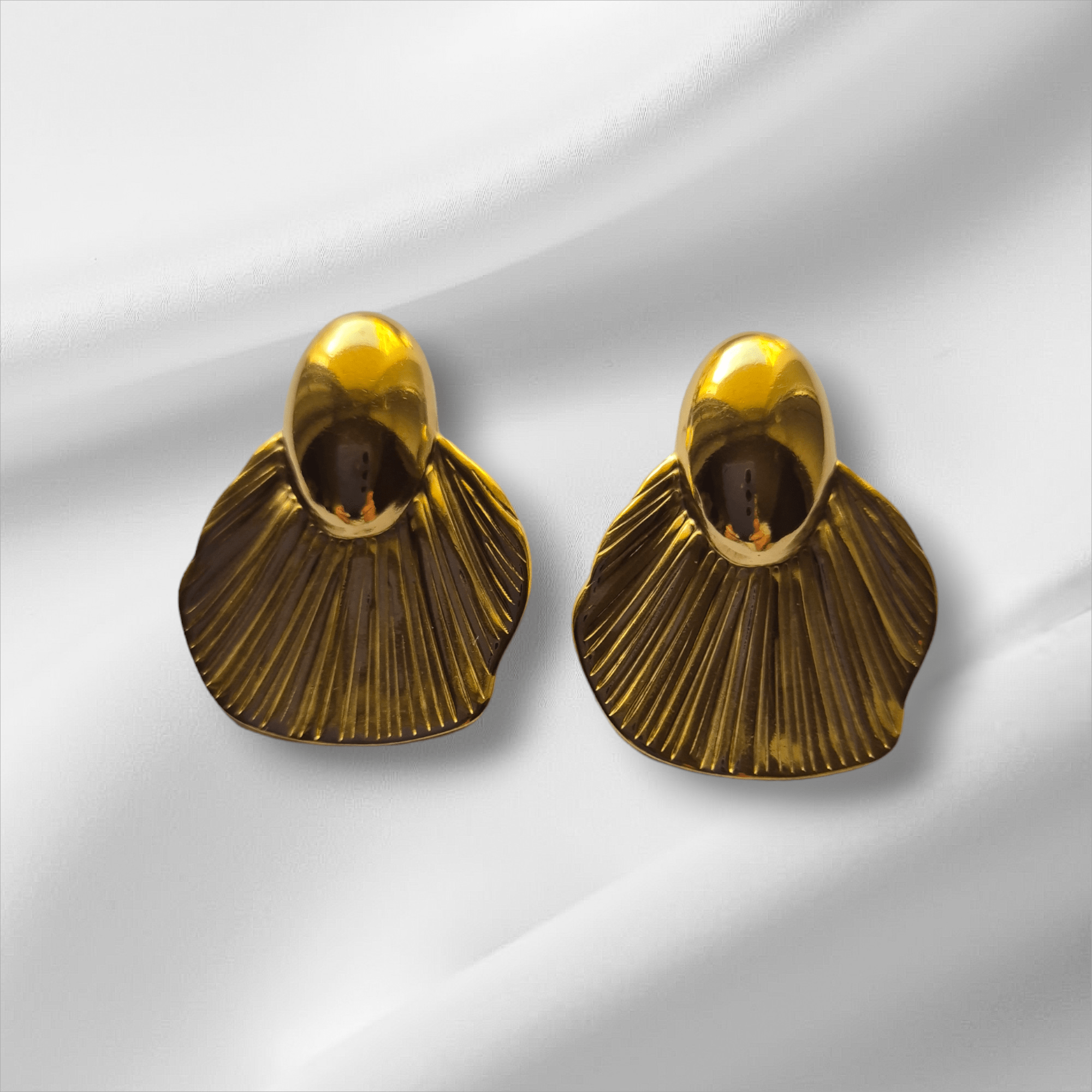Αυτά τα σκουλαρίκια είναι κατασκευασμένα από ατσάλι και διαθέτουν έναν εντυπωσιακό σχεδιασμό. Το άνω μέρος τους είναι στρογγυλεμένο με λαμπερό χρυσό φινίρισμα, ενώ το κάτω μέρος έχει μια υφή που θυμίζει φύλλο ή φτερό, προσθέτοντας βάθος και κομψότητα. Είναι ιδανικά για να αναδείξουν μια μοναδική εμφάνιση.