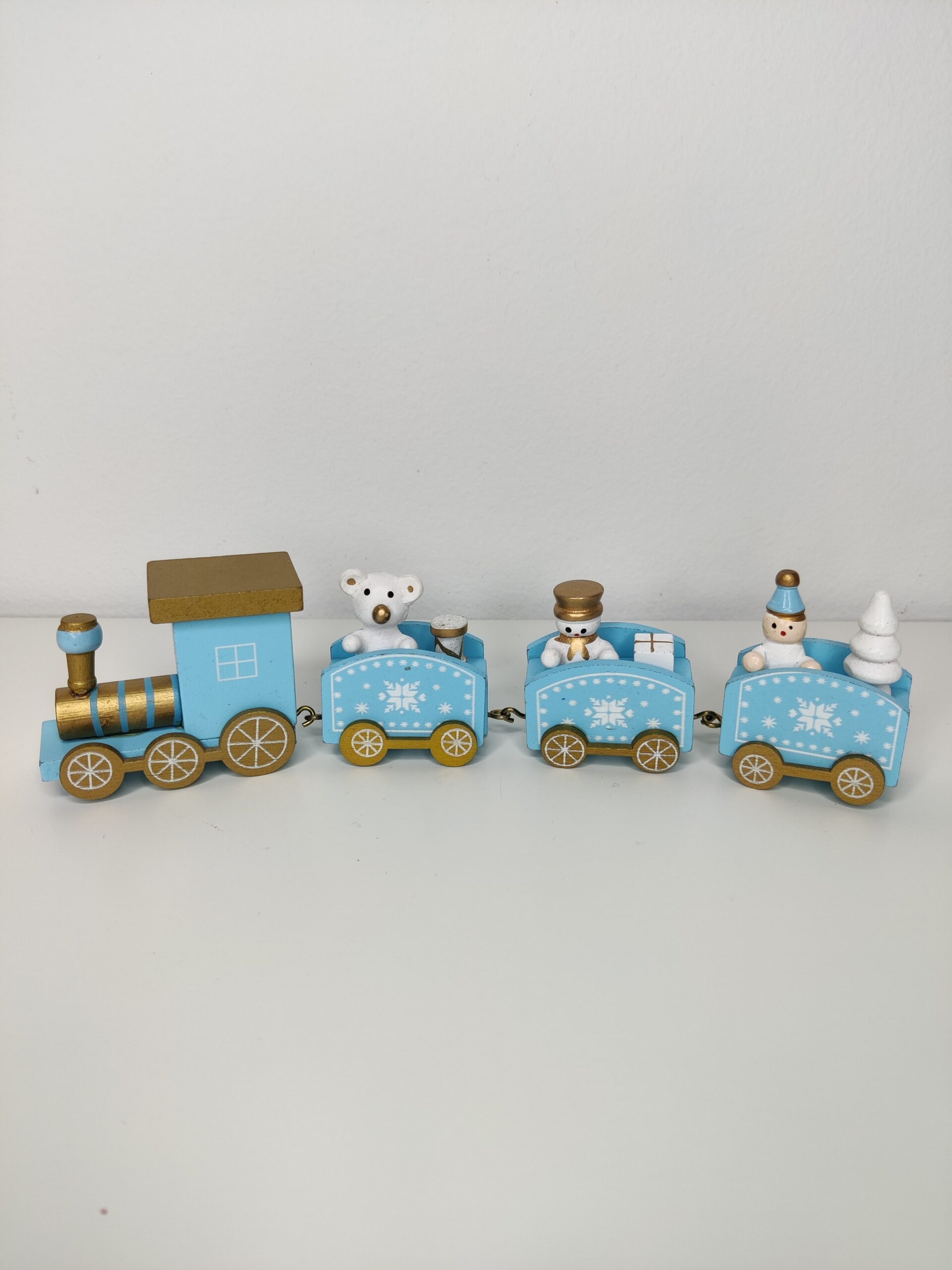 Ξύλινο διακοσμητικό μπλε τρενάκι στη συλλογή σας! Αυτό το γοητευτικό διακοσμητικό φέρνει το πνεύμα των Χριστουγέννων στο σπίτι σας με τον χαρούμενο χρωματισμό του και τα γλυκά χριστουγεννιάτικα στοιχεία στα βαγόνια του.