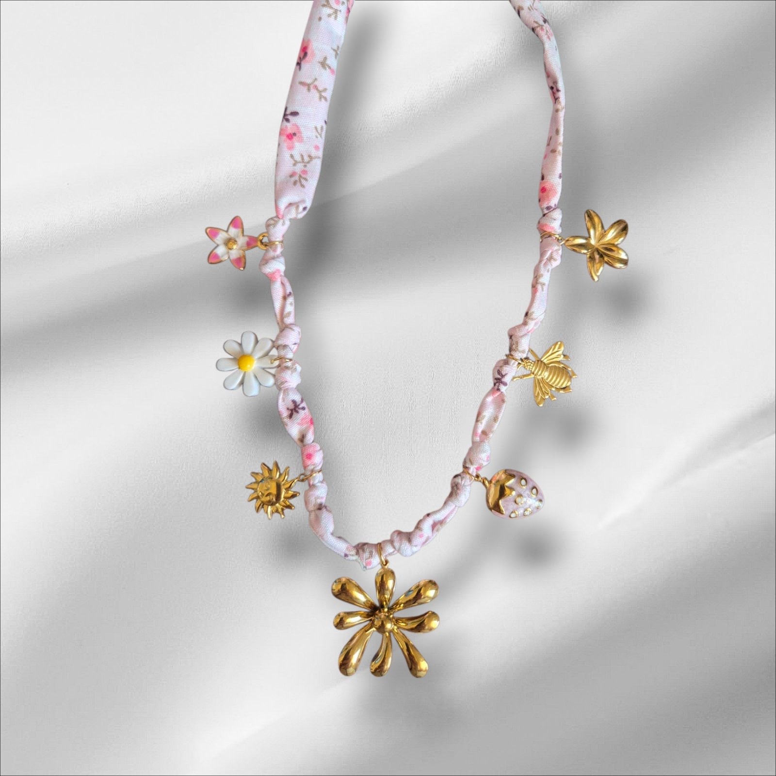 Ρομαντικό και γεμάτο λουλουδένια διάθεση, το Little Spring συνδυάζει floral υφασμάτινο κορδόνι με χρυσά και πολύχρωμα charms: μαργαρίτες, ήλιο, μέλισσα και μια γλυκιά φράουλα. Είναι το ιδανικό αξεσουάρ για να φωτίσει κάθε look και να σας φτιάξει τη μέρα!