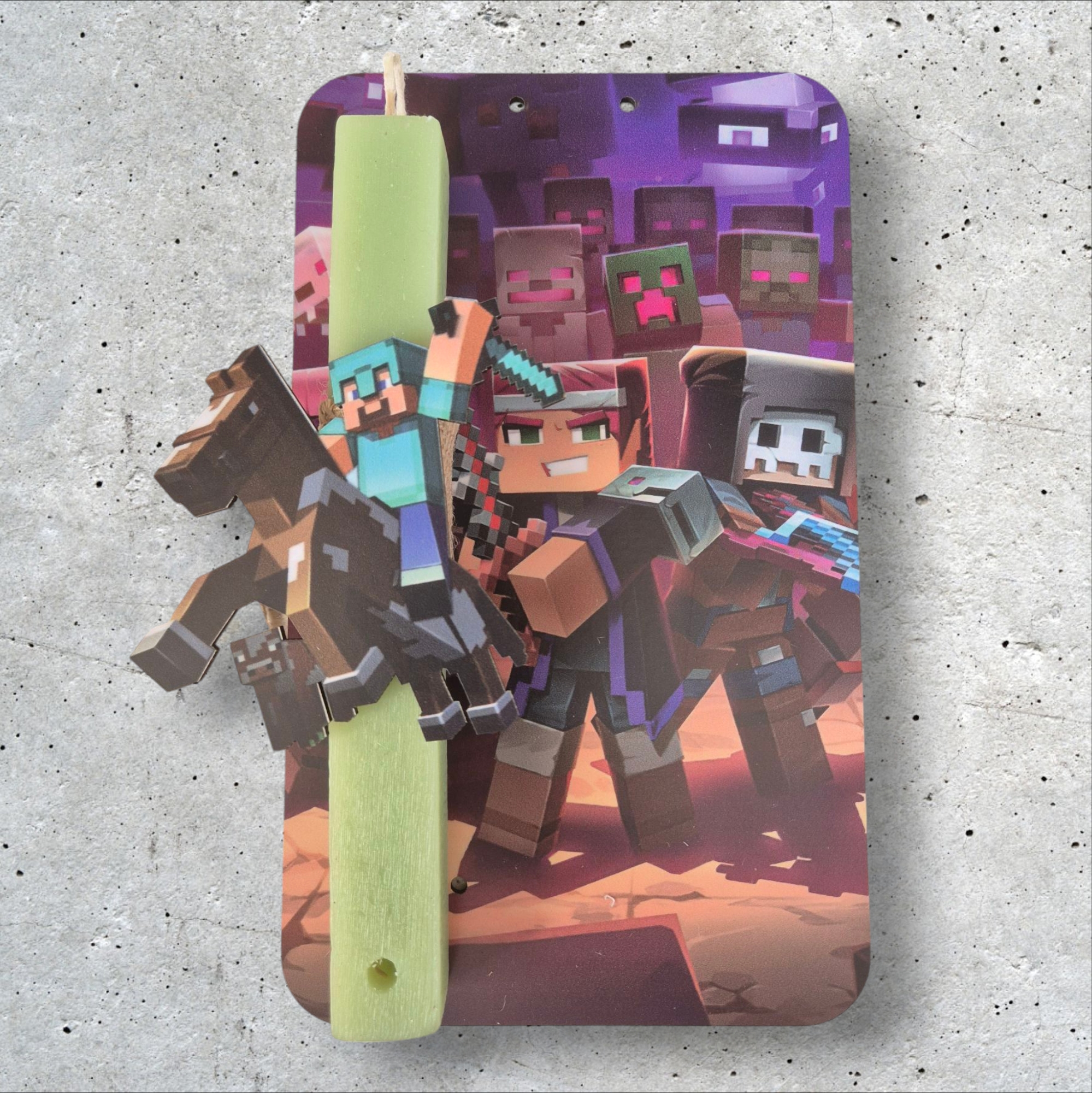 Σε φυστικί απόχρωση, ύψους 22cm, με ξύλινο διακοσμητικό 25cm εμπνευσμένο από το αγαπημένο Minecraft που έχει κλέψει καρδιές (και ώρες ύπνου).