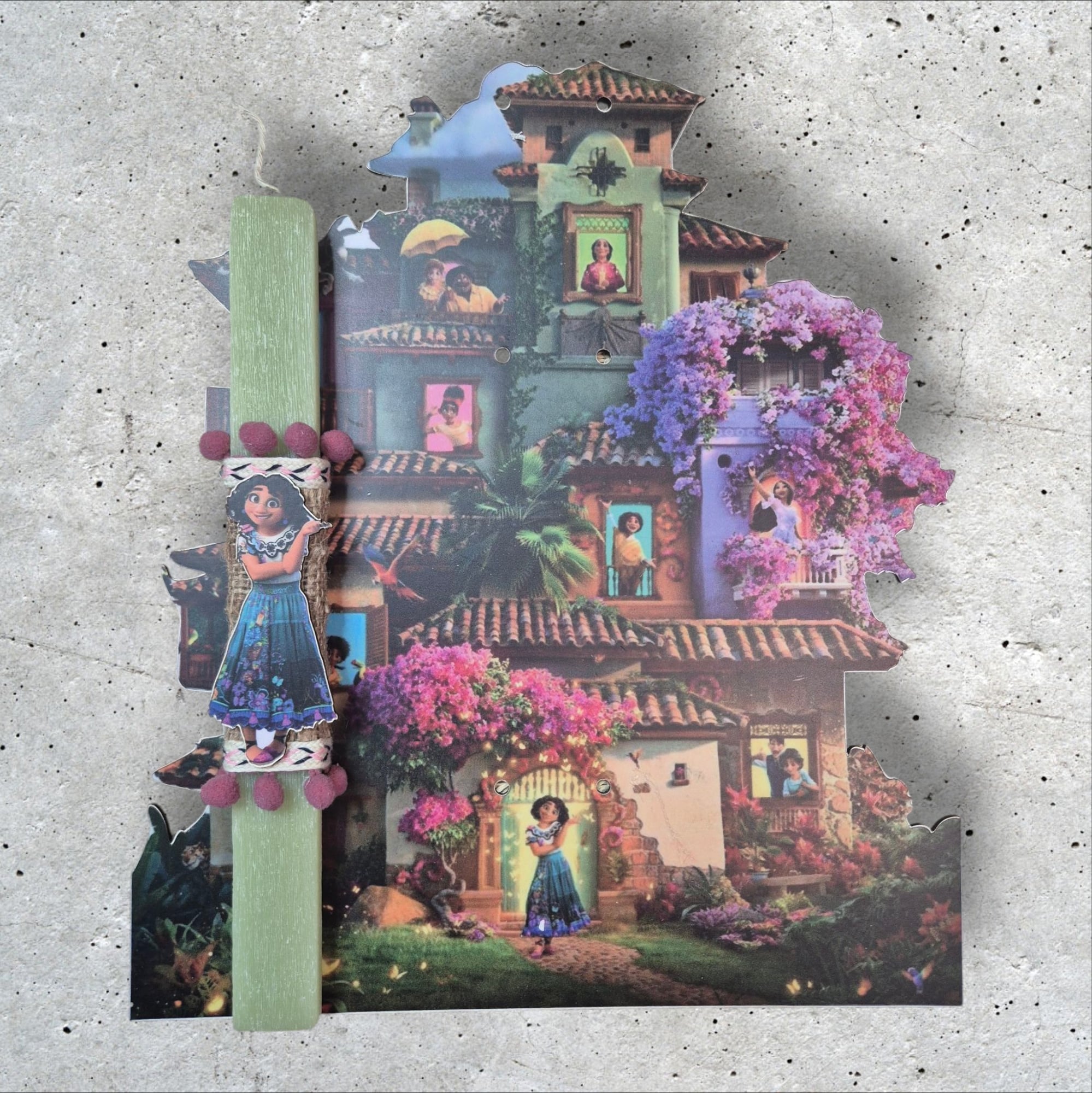 Φέρε τη μαγεία του Encanto στον χώρο σου με αυτή την υπέροχη λαμπάδα από ανοιχτό πράσινο κερί, ύψους 30cm! Στην κορυφή της, η αγαπημένη Mirabel είναι έτοιμη να φέρει λίγη από την ανεξίτηλη ενέργεια της οικογένειας Μαδριγάλ! Η λαμπάδα συνοδεύεται από ένα ακόμα ξύλινο στοιχείο ύψους 35cm, που απεικονίζει το μαγευτικό σπίτι της οικογένειας Μαδριγάλ, γεμάτο χρώματα και θαύματα. Ιδανική για να την κρεμάσεις και να φέρεις λίγη από την ομορφιά του Encanto στον χώρο σου ή να τη βάλεις στο γραφείο για να σου θυμίζει πως η μαγεία κρύβεται παντού γύρω μας!