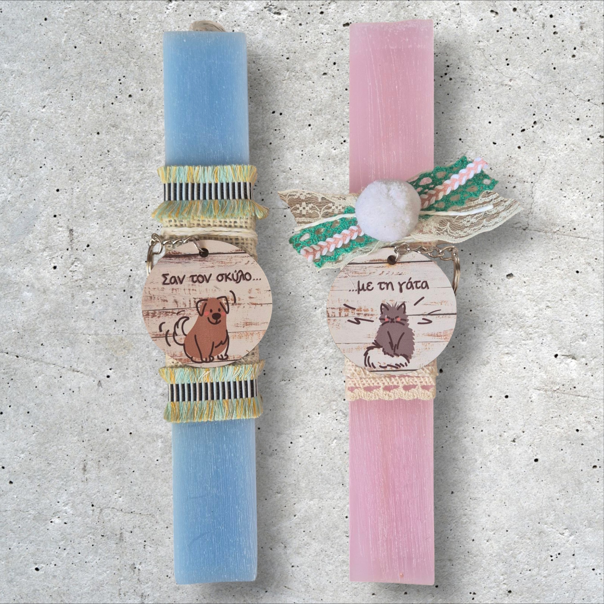 Αυτό το σετ είναι ιδανικό για φίλους ή ζευγάρια που αγαπούν τη χαρά και την ατμόσφαιρα των γιορτών. Περιλαμβάνει δύο λαμπάδες ύψους 25 εκ. σε γαλάζιο και ροζ χρώμα, που θα φωτίσουν το Πάσχα σου με τον πιο παιχνιδιάρικο τρόπο. Και το καλύτερο; Κάθε λαμπάδα φέρει ξύλινο στοιχείο με αστείες επιγραφές: «Σαν το σκυλό» / «Με τη γάτα», προσφέροντας την τέλεια δόση χιούμορ για το γιορτινό τραπέζι! Άναψέ τις και άφησέ τις να φωτίσουν την ημέρα σου με χαμόγελα και γέλια!