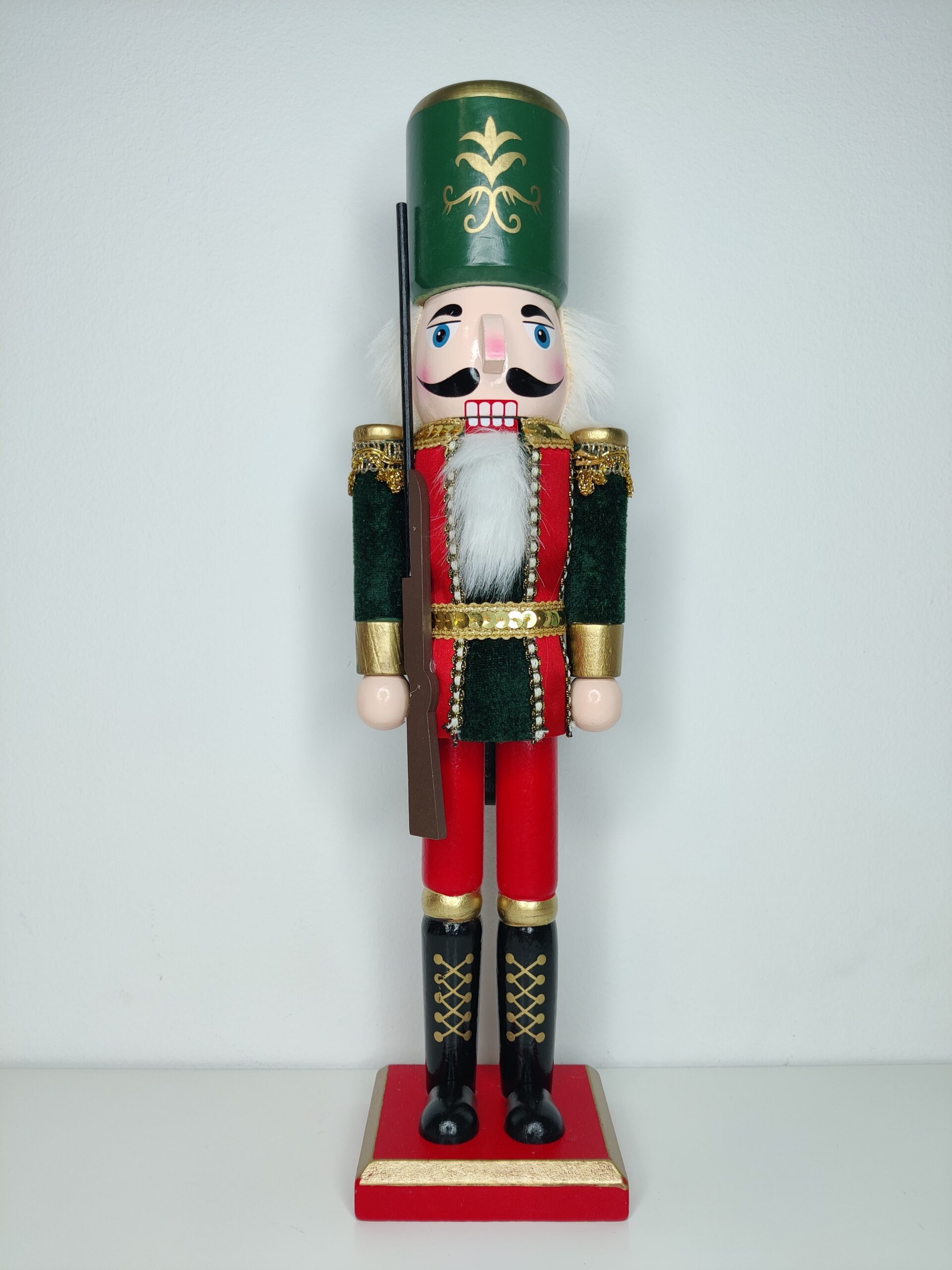 Φορώντας μια βελούδινη πράσινη – κόκκινη στολή που αντικατοπτρίζει το πνεύμα των εορτών, και με ένα πράσινο καπέλο που προσθέτει μια παιχνιδιάρικη νότα, αυτός ο καρυοθραύστης κρατάει μια καραμπίνα προσφέροντας μια μοναδική και εντυπωσιακή εικόνα.