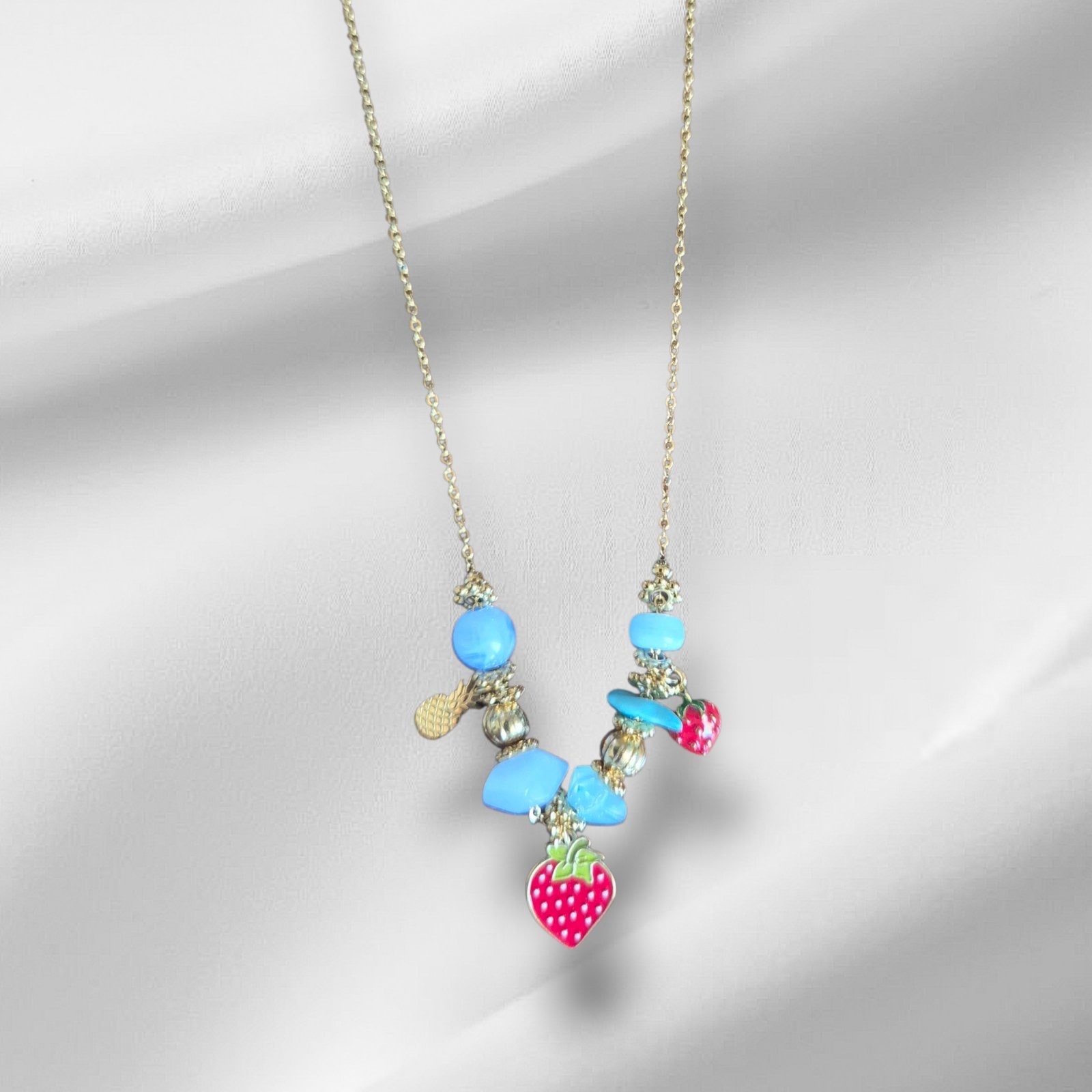 Αυτό το μοναδικό κολιέ συνδυάζει χρυσή αλυσίδα με πολύχρωμες χάντρες και παιχνιδιάρικα charms όπως φράουλες, ανανάδες και τιρκουάζ λεπτομέρειες. Ιδανικό για να φωτίσει κάθε outfit και να σας βάλει αμέσως σε mood διακοπών!